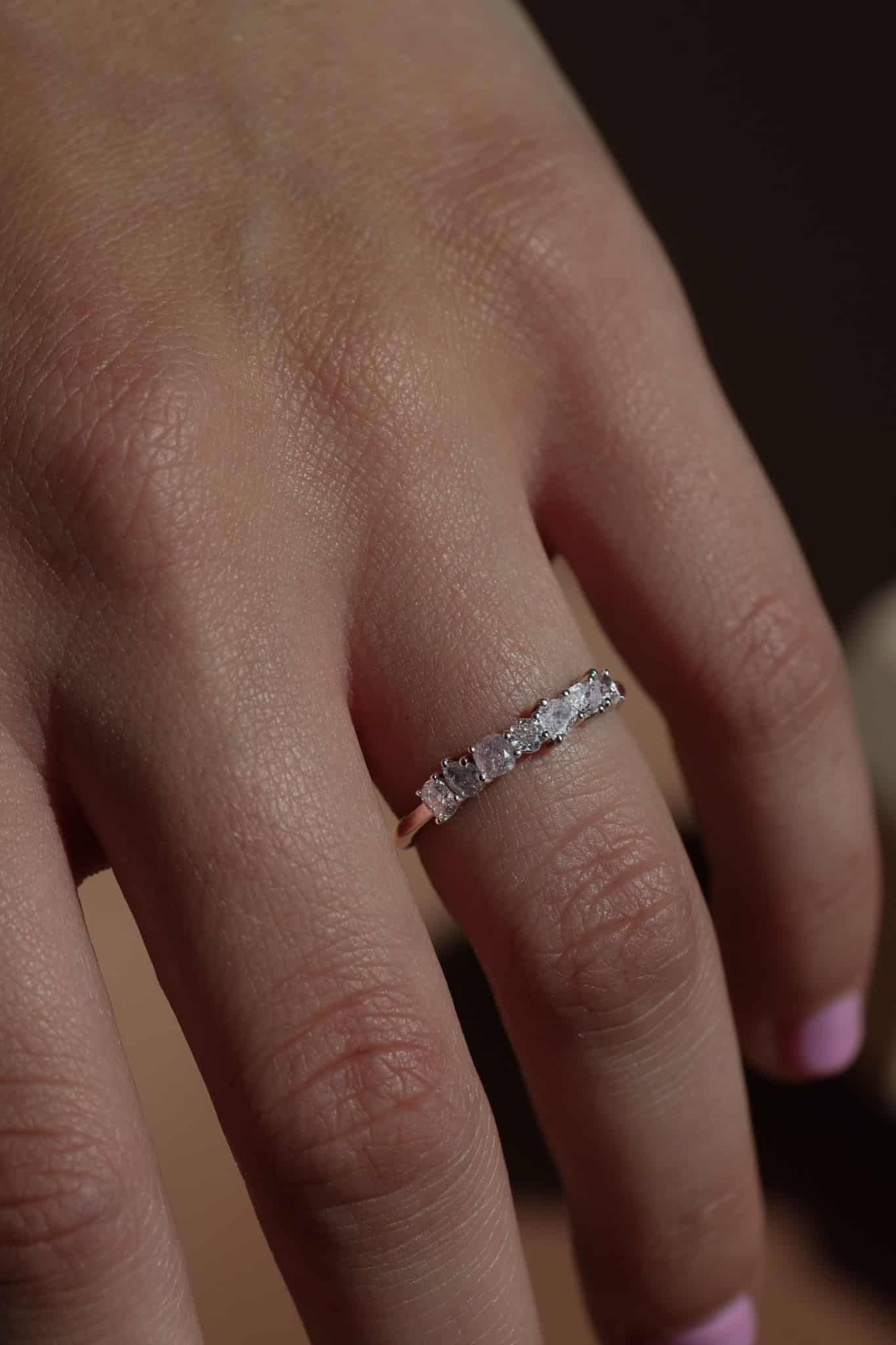 This playful scatter ring features a variety of Natural pink diamonds, in different cuts. Handcrafted in 18ct White Gold.